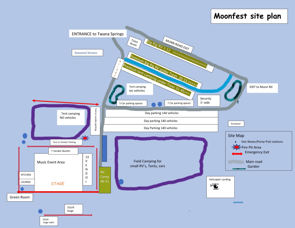 Moon-Fest is held at Twana Springs. A privately owned 44-acre site with a gently sloping field with Lake Leland in the background.